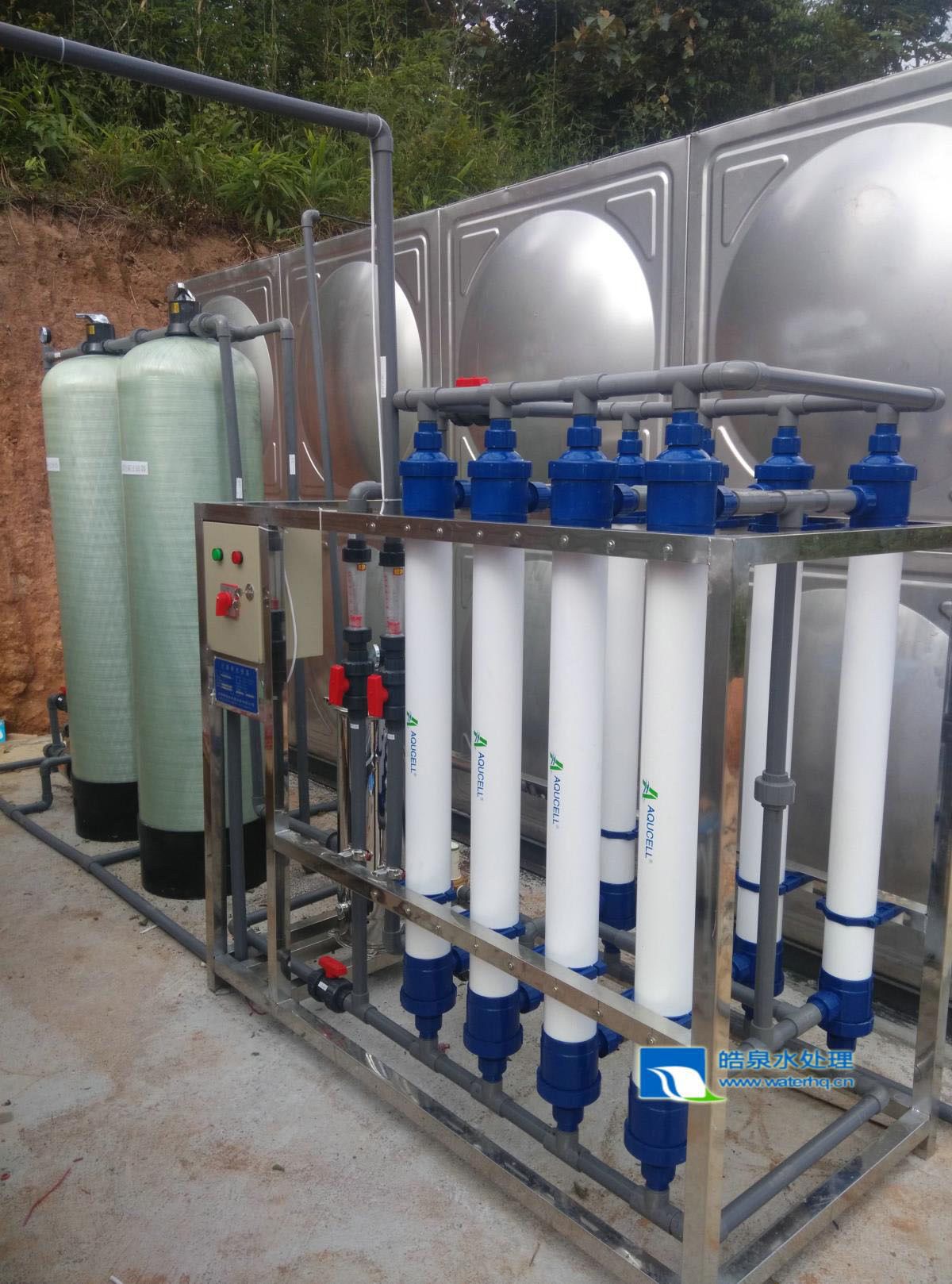 原水箱→原水泵→石英砂過濾器→活性炭過濾器→精密過濾器→超濾設(shè)備→凈水箱
