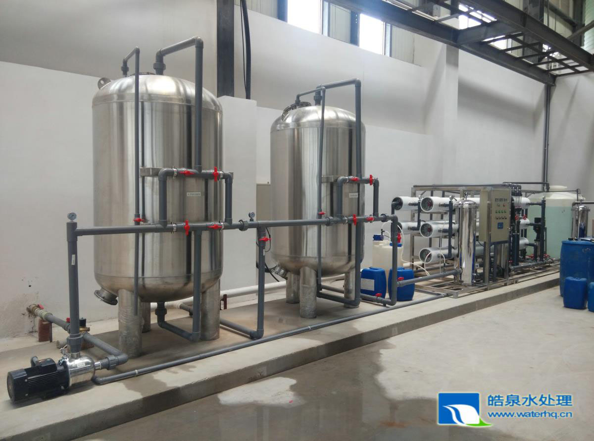 原水箱→原水泵→石英砂過(guò)濾器→活性炭過(guò)濾器→加藥阻垢裝置→保安過(guò)濾器→一級(jí)反滲透設(shè)備→中間水箱→二級(jí)反滲透設(shè)備→純水箱